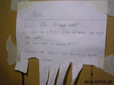 Alibi för i lördags natt! (Vi kan ha sett en film hemma hos mig eller nått) Vore bra om ni svara fort! Behöver du alibi? Då kan vi ju byta!!!"