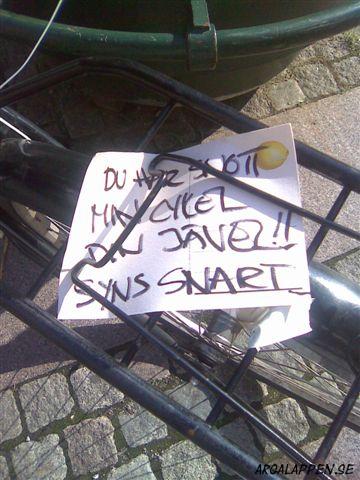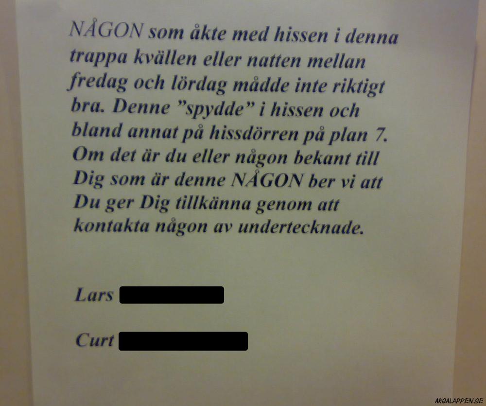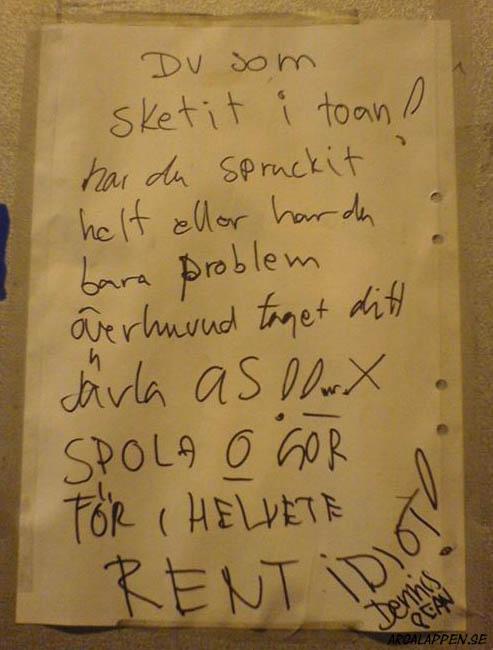 "Vem/vilka av er är det som ställer ut soporna direkt utanför porten? Satans mygghjärna, tar det för mycket energi att gå runt hörnet och slänga dem, eller är du för lat för att gå ut? För fet för att komma ut genom dörren? Suck... Hoppas ditt anus får tänder och äter upp dig då du sover."
