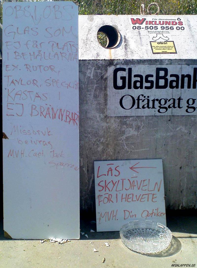 "OBS OBS GLAS SOM EJ FÅR PLATS I BEHÅLLAREN EX. RUTOR, TAVLOR, SPEGLAR KASTAS I EJ BRÄNNBAR. Missbruk beivras MVH Capt. Jack Sparrow"