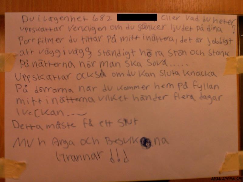 "Du i lägenhet 682, XXX eller vad du heter uppskattar verkligen om du sänker ljudet på dina Porrfilmer du tittar på mitt i nätterna, det är jobbigt att vägg i vägg ständigt höra stön och stonk På nätterna när man ska sova.....