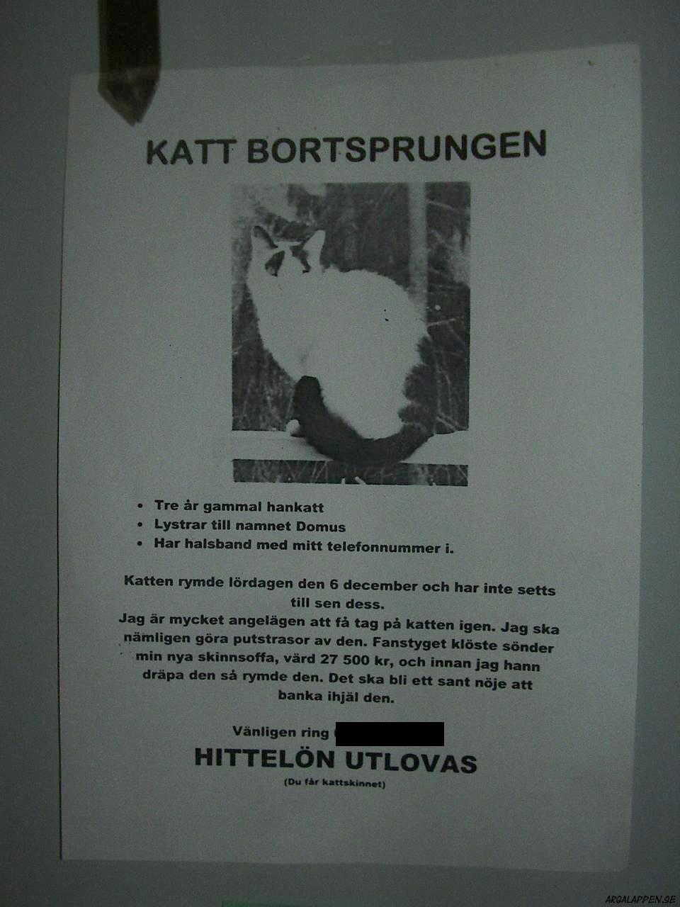Katten rymde lördagen den 6 december och har inte setts till sen dess. Jag är mycket angelägen på att få tag på katten igen. Jag ska nämligen göra putstrasor av den. Fanstyget klöste sönder min nya skinsoffa, värd 27.500kr, och innan jag han dräpa den så rymde den. Det ska bli ett sant nöje att banka ihjäl den.