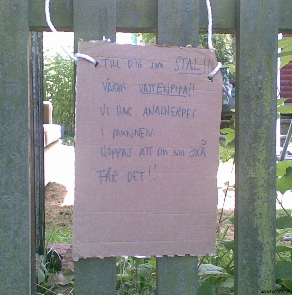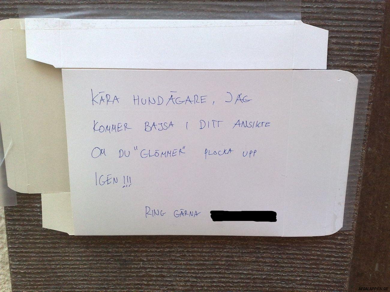 - Nu får det vara nog! I tre månaders tid har vi vaknat av att det plumsar i toaletten tidigt på morgonen. Det har väckt hela familjen åtskilliga gånger. Vad ska vi säga till barnen när de undrar vad det är som låter? Kan ni inte vara vänliga och visa oss den hänsyn alla förtjänar. Om detta fortsätter tvingas vi ta kontakt med bostadsvärden. TACK! /Grannarna på 2an