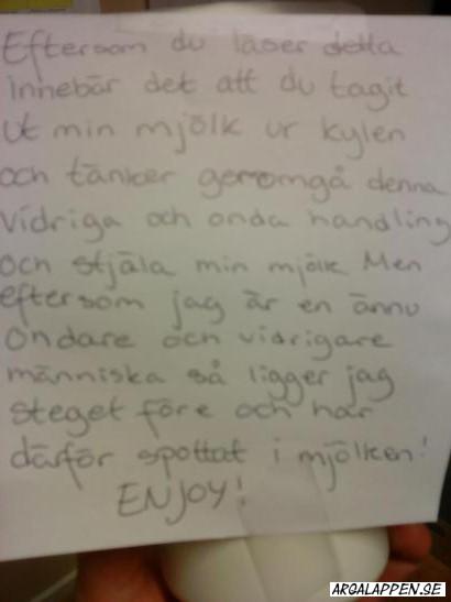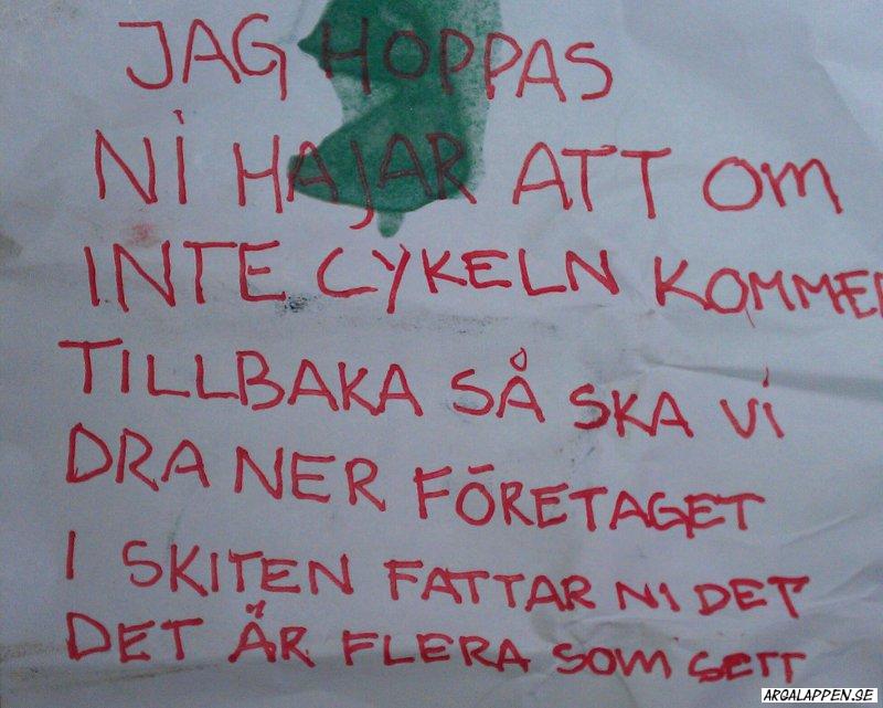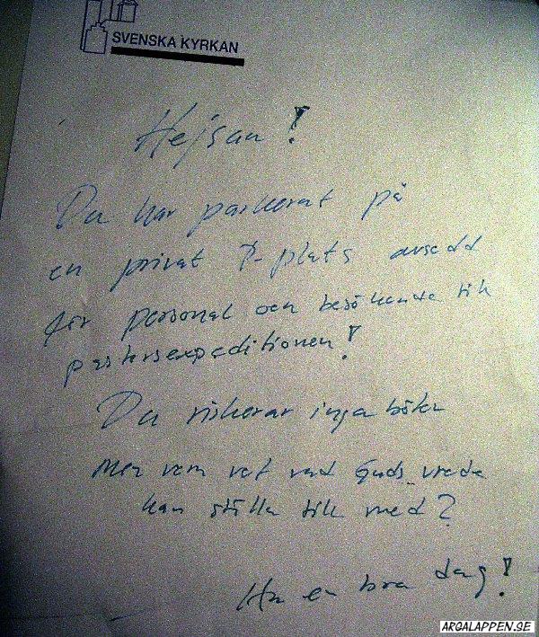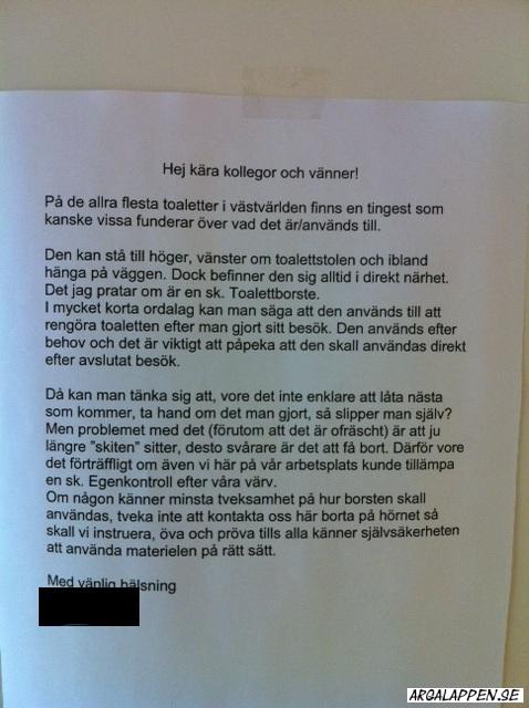 En mycket välskriven lapp detta. Den som skickat in lappen har angett att den kommer från en arbetsplats på Virkesvägen 10 i Hammarby Sjöstad.