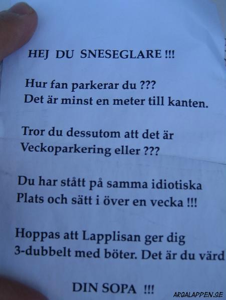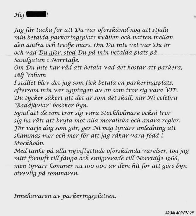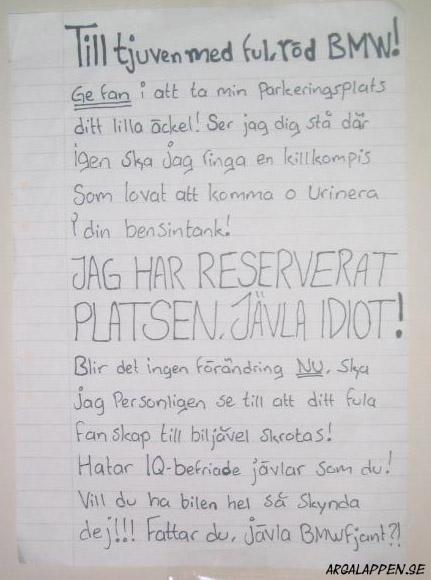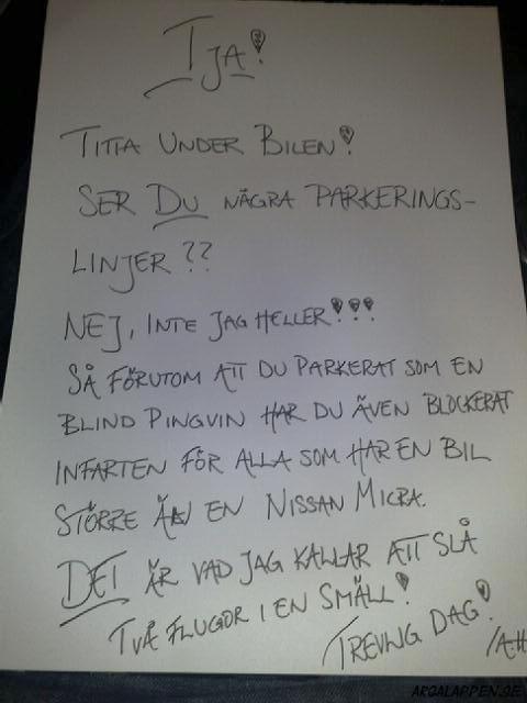 "Eftersom du parkerar som en efterbliven så var jag tvungen att knäcka din sido spegel för att kunna komma in i min bil. Jag hör av mig så vi kan komma överens om hur du ska ersätta mig för tvätten av min jacka som blev smutsig då."