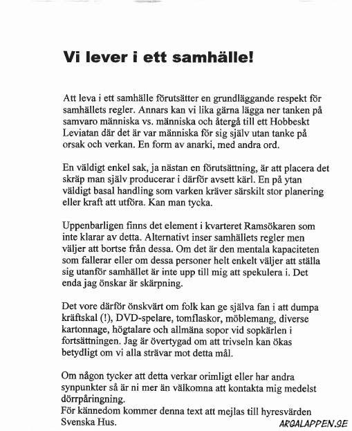 Jag håller väl med om tanken i brevet, men hade det inte varit enklare at kontakta hyresvärden och be de sätta upp reglerna....så kanske någon brytt sig. Nu är det bara nån hobbypolis som tror han/hon kan visa sig "akademisk" genom att använda överdriver högdraget språk för att framföra ett enkelt önskemål .... framstår bara som en fjant. http://www.observeheadlines.com/
