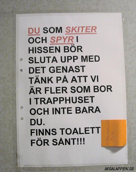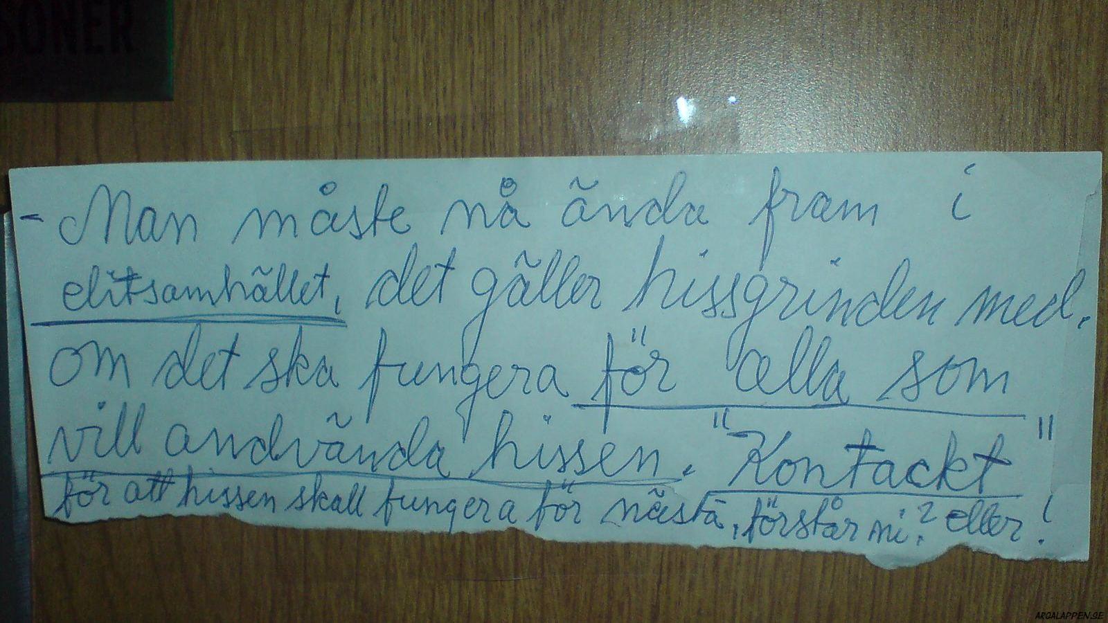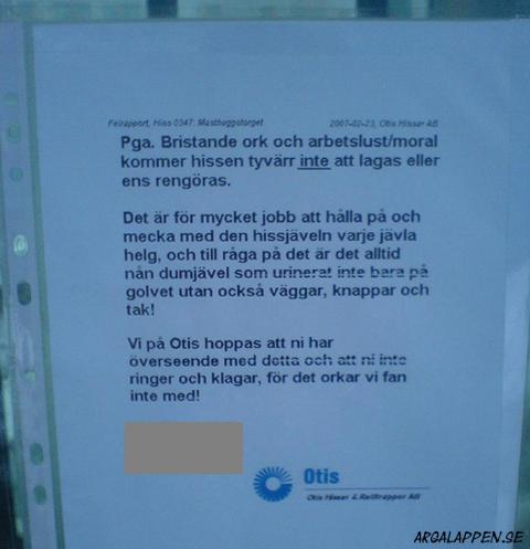 'Idag hjälpte jag min syster att flytta. Ganska snart kom en av grannarna och klagade på att vi blockerade hissen eftersom någon ville åka just då. Okey, vi tömde hissen så fort vi kunde och packade in sakerna i kärran. Under tiden var det exakt noll personer som använde hissen. Under resten av flytten var det någon som ständigt tryckte på hissknapparna så att hissen åkte upp och ner så fort vi inte blockerade dörren. Ingen åkte!? När vi nästan var klara satt denna lapp i hissen...'