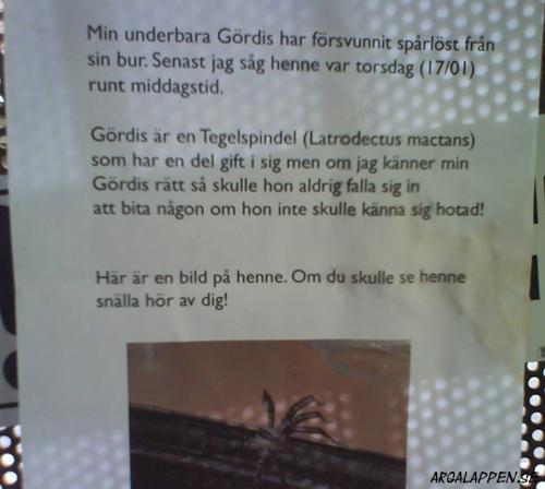 Ha ha ha... jag är LIVRÄDD för spindlar, hade nog flyttat om den lappen satt i min trappuppgång...