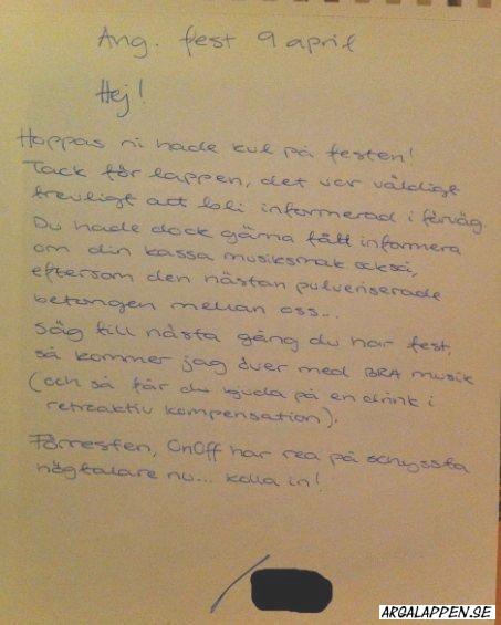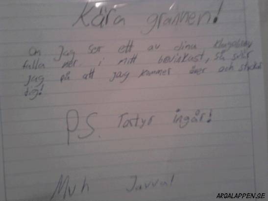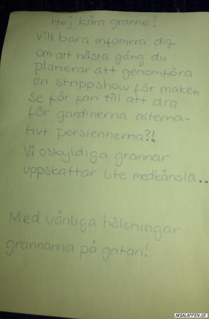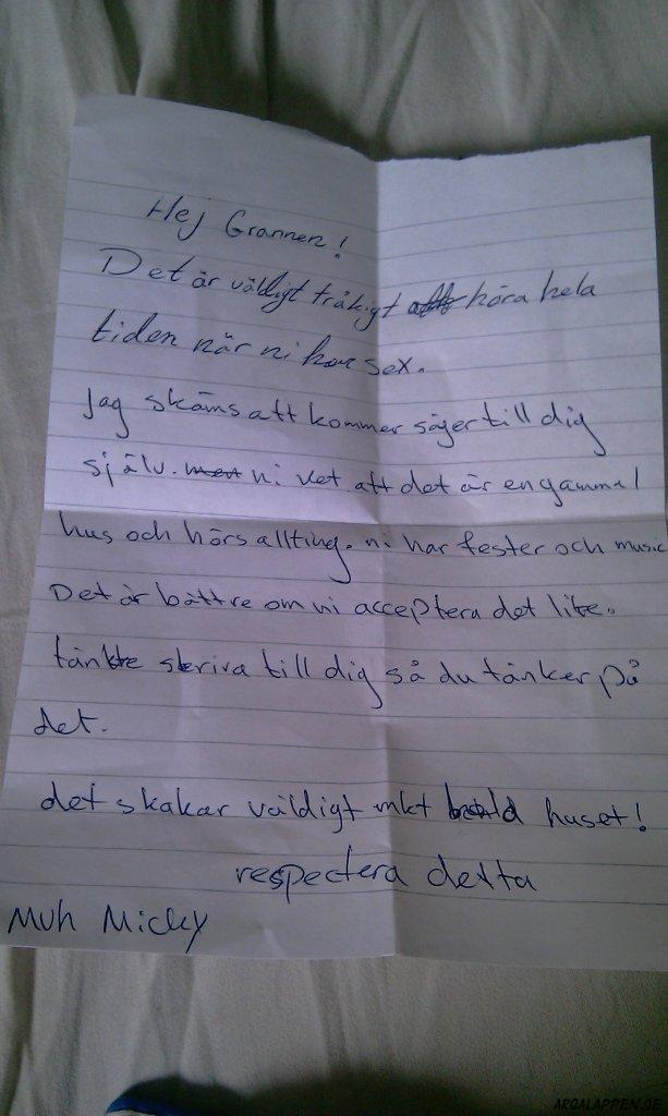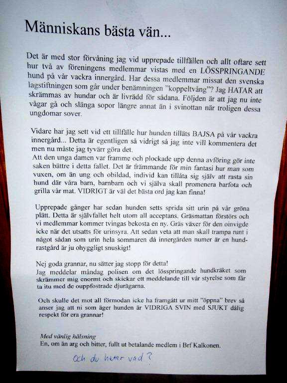 Personen som skickade in lappen har fått en ny granne - verkar trevlig! NOT!