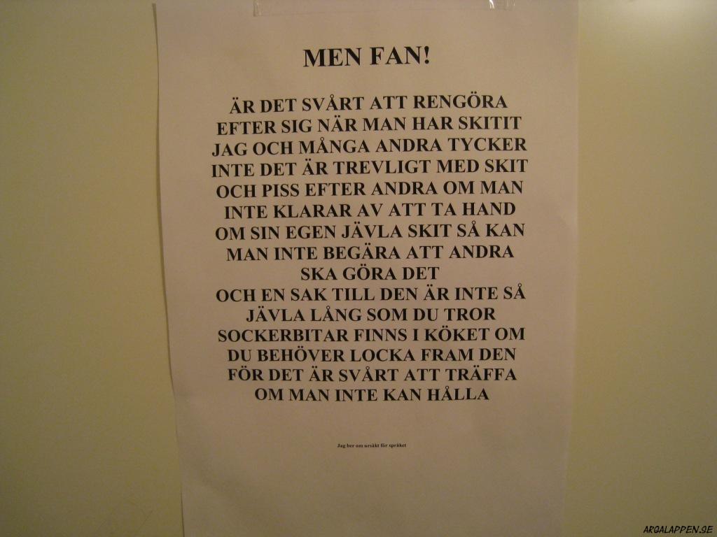 Arga Lappen är en blogg som frossar i de där små subtila budskapen vi människor kommunicerar med i köket, i förrådet, i tvättstugan, ja i princip överallt där vi delar utrymme och umgås (eller inte) med andra.
