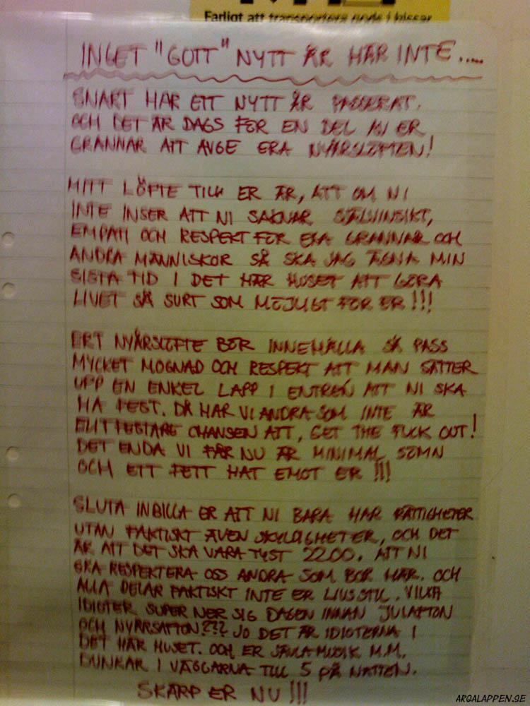 Ert nyårslöfte bör innehålla så pass mycket mognad och respekt att man sätter upp en enkel lapp i entrén att ni ska ha fest. Då har vi andra som inte är elitfestare chansen att get the fuck out! Det enda vi får nu är minimal sömn och ett fett hat mot er!!!