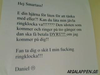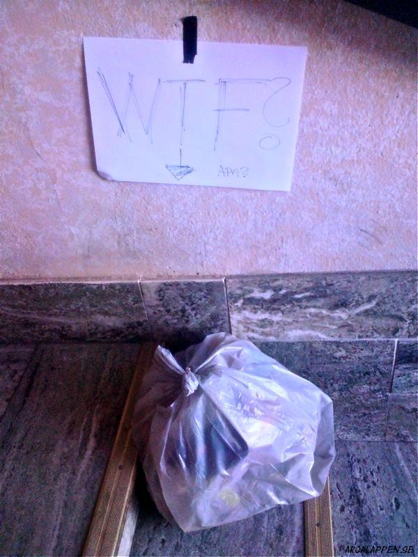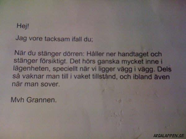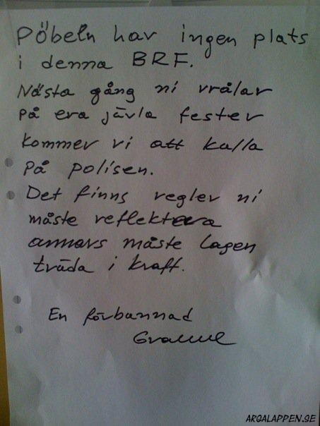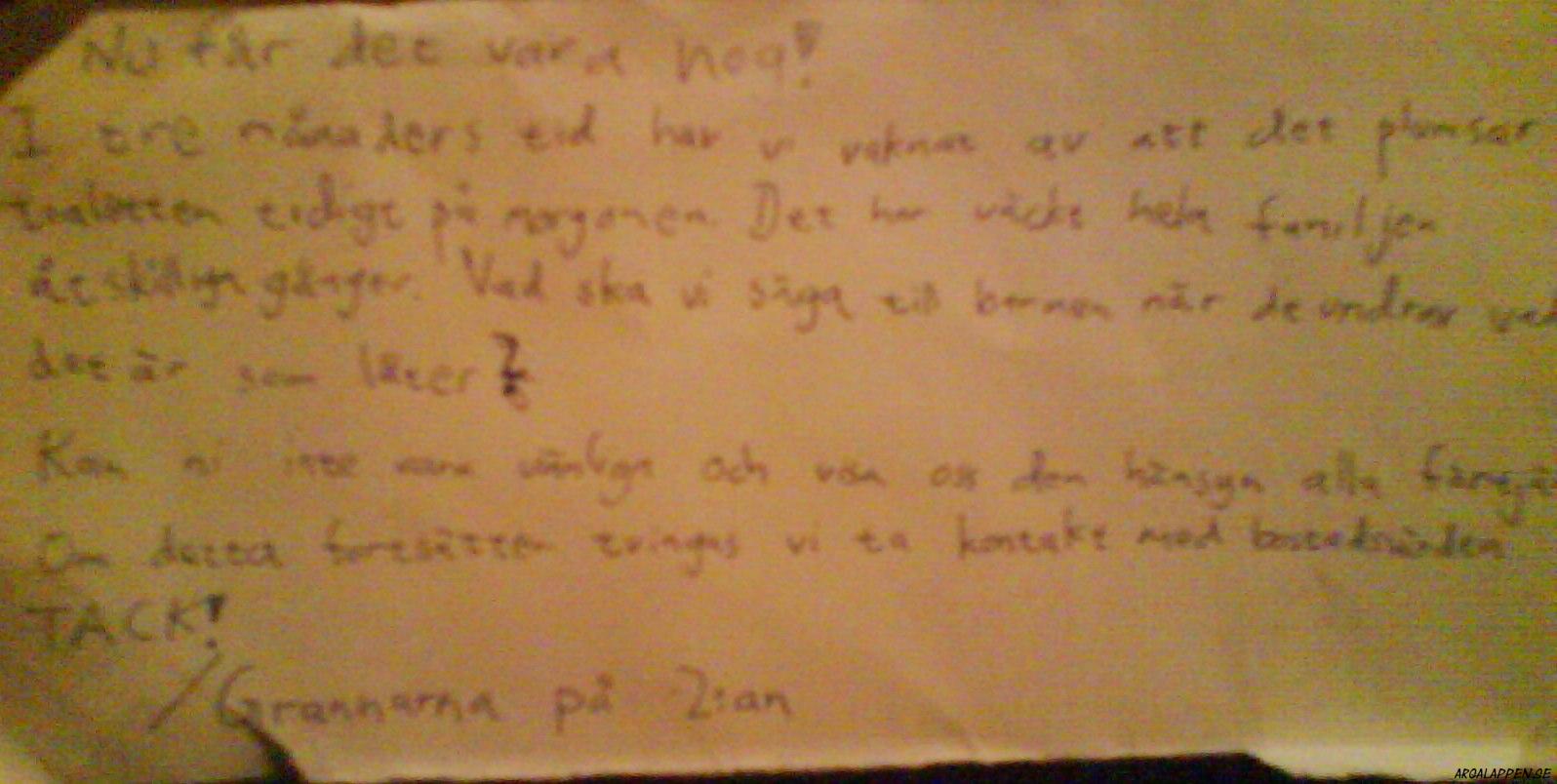 - Nu får det vara nog! I tre månaders tid har vi vaknat av att det plumsar i toaletten tidigt på morgonen. Det har väckt hela familjen åtskilliga gånger. Vad ska vi säga till barnen när de undrar vad det är som låter? Kan ni inte vara vänliga och visa oss den hänsyn alla förtjänar. Om detta fortsätter tvingas vi ta kontakt med bostadsvärden. TACK! /Grannarna på 2an