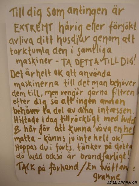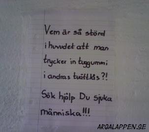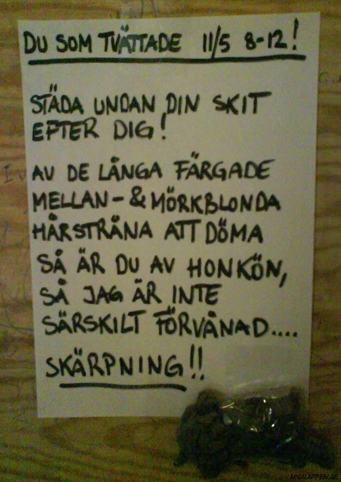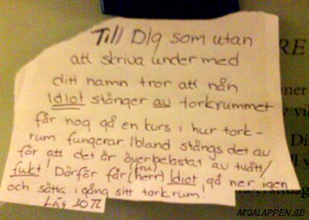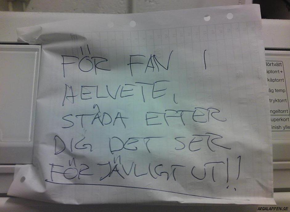 Arga Lappen är en blogg som frossar i de där små subtila budskapen vi människor kommunicerar med i köket, i förrådet, i tvättstugan, ja i princip överallt där vi delar utrymme och umgås (eller inte) med andra.